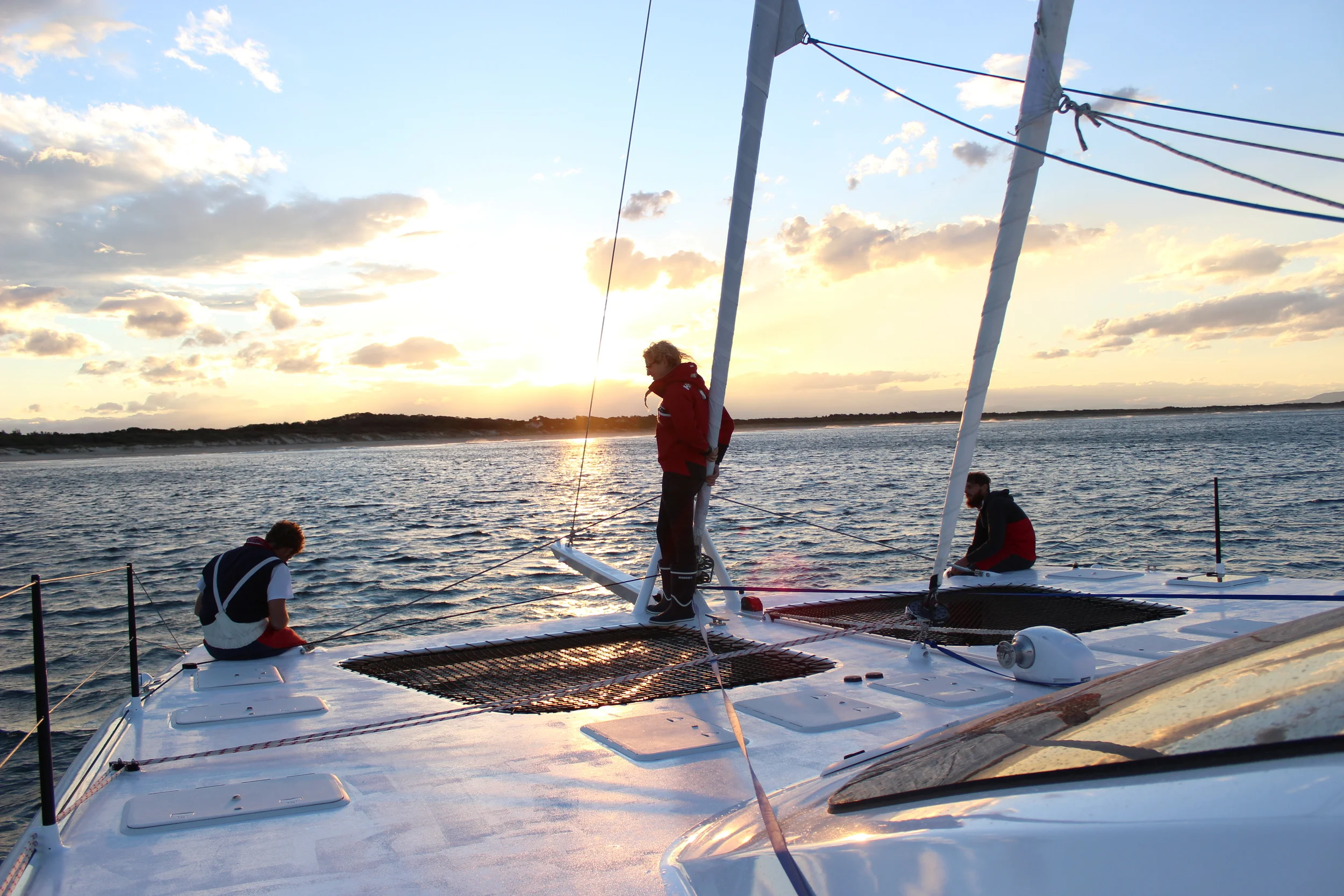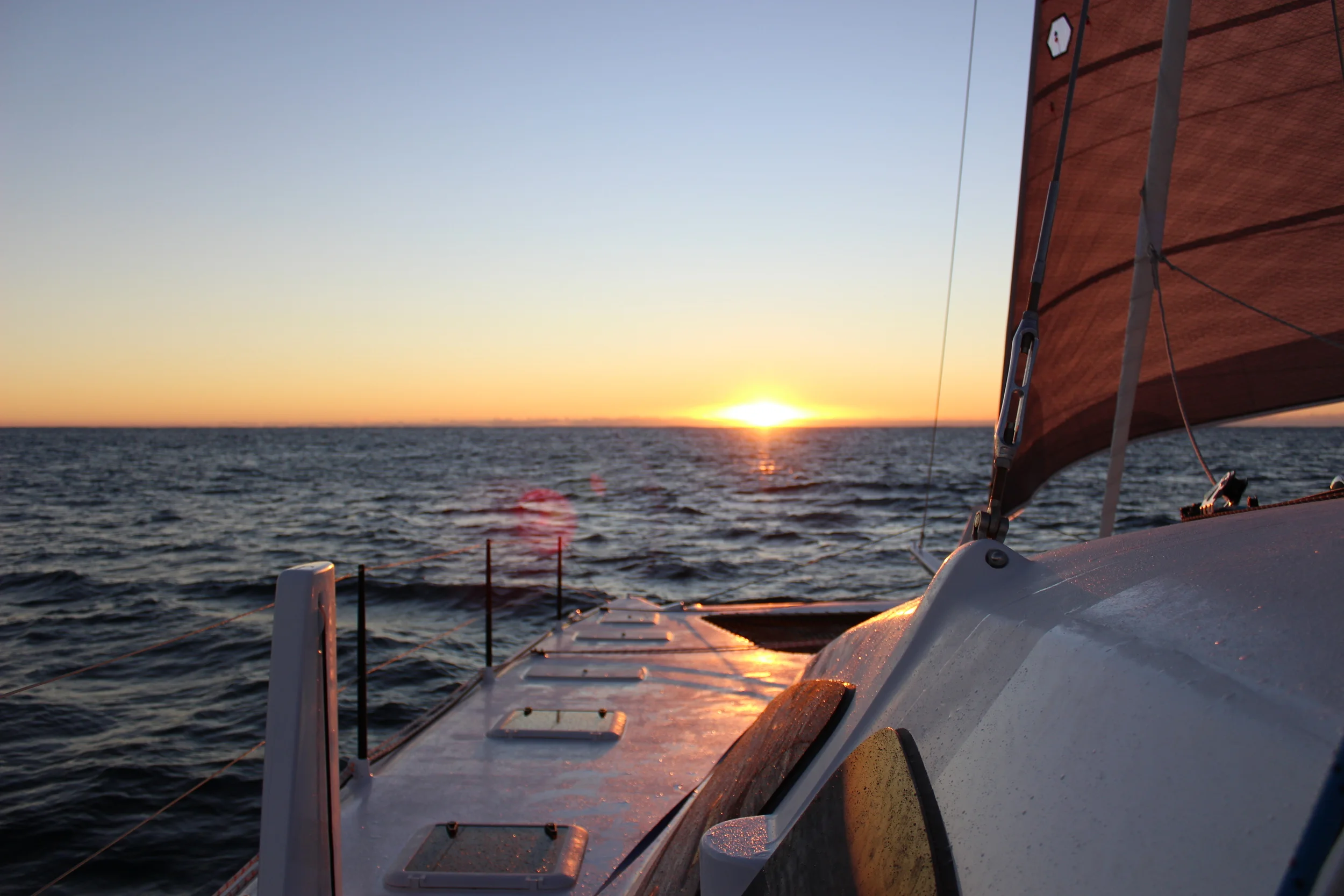 New Roam Crew member Holly at the helm and Andy watching over her as the sun sets behind us.