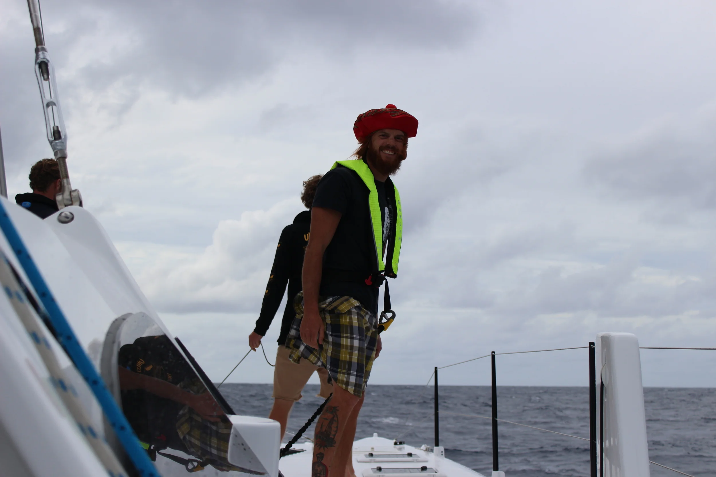 The forecast looks good for the entire sail to New Cal. Alarms go off at 5.45am and we sail Roam off the anchor by 6.30am, heading for New Caledonia. The sailing conditions are ideal, gliding downwind, averaging around 8 knots but picking up as the day goes on and the wind builds into the evening. A spectacular sunset on our first night at sea of the voyage, sets the tone for the rest of the trip. Celebrations for team Roam with a sunset rumbo. It's my night off as I won Uno last night. Andy and Holly are on first watch while Mick and Iain get some sleep. I was enjoying my evening off practicing playing some uke chords, enjoying the night air and star filled sky in the cockpit when, all of a sudden i feel a thud right in my chest. A wet object had hit me, I looked up into the door way of the saloon for a second thinking I would see Andy grinning back at me with a guilt stricken face ... But no, it wasn't a dish cloth. There was a small flying fish flapping around on the cock pit floor. With absolute surprise all I could do was laugh it off. I just got hit by a flying fish.