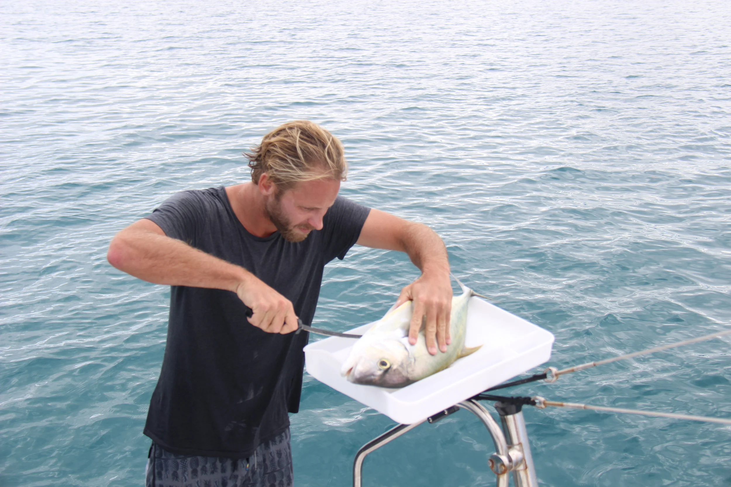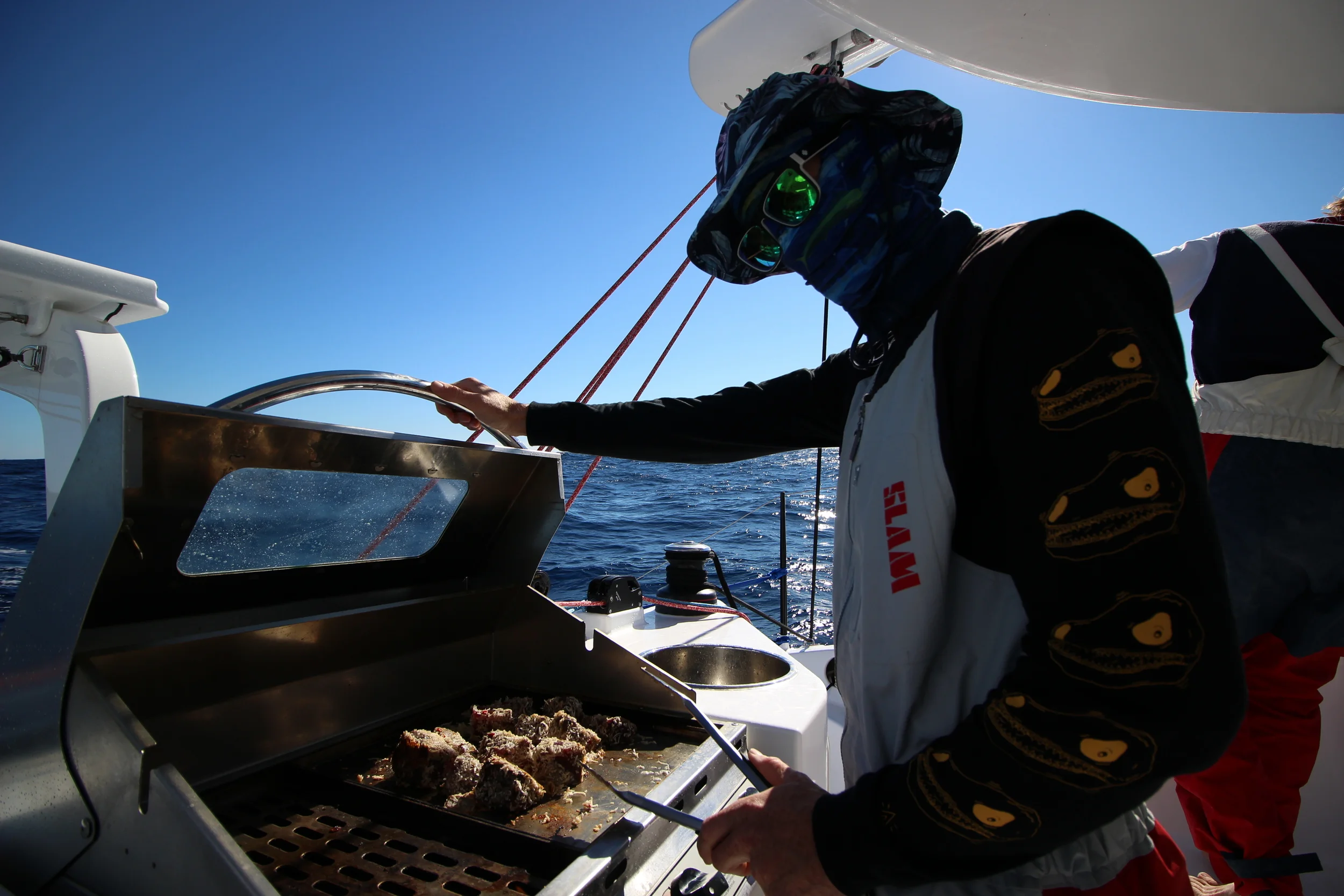 Captain Mick cooking up the Tuna we caught on the way on the BBQ. Sporting his full sun protection. You need it living on a boat exposed to the sun majority of the day.