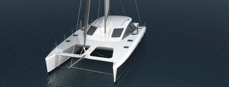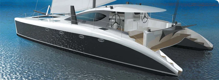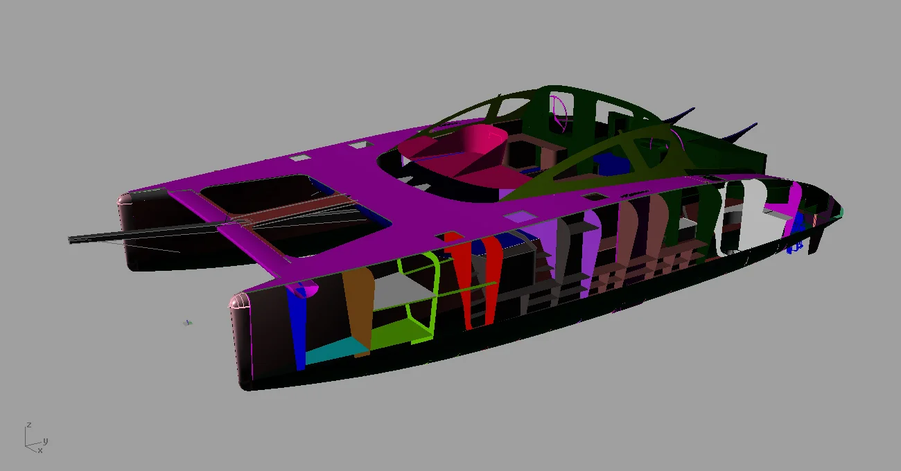 The 3D model of ROAM as produced by Spirited Designs. From this file the parts for the entire boat from the full hull side to the smallest furniture shelf are nested and CNC cut into the composite panels produced by ATL Composites. The design was finalised by March 2009.