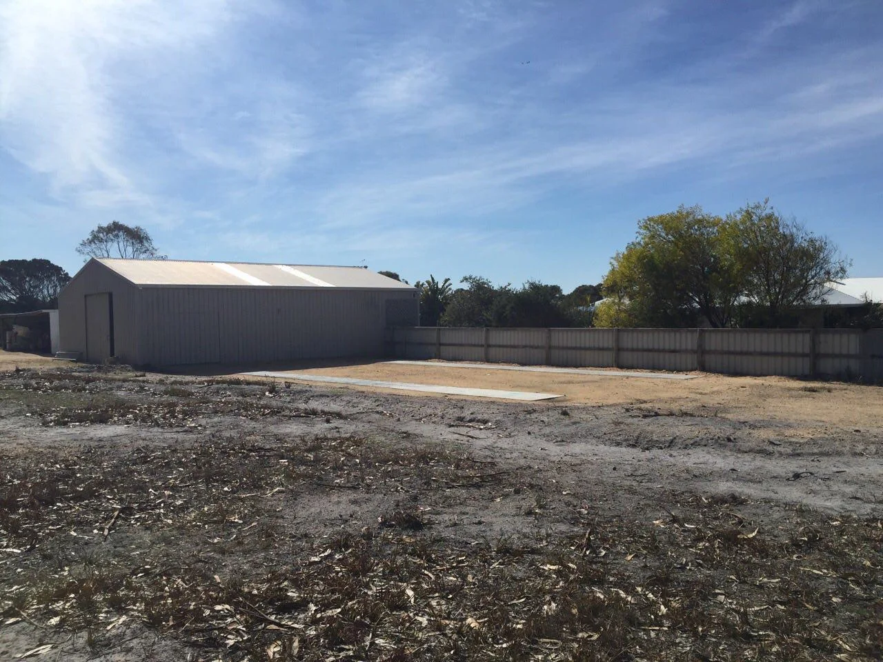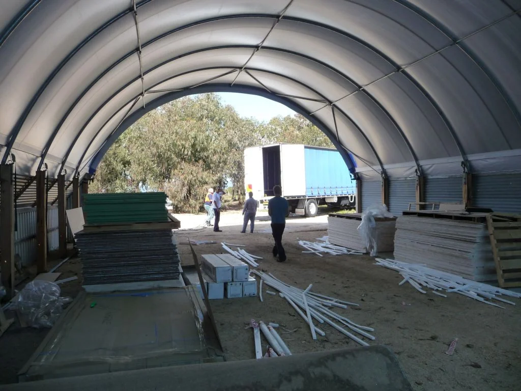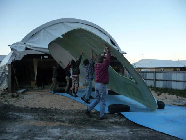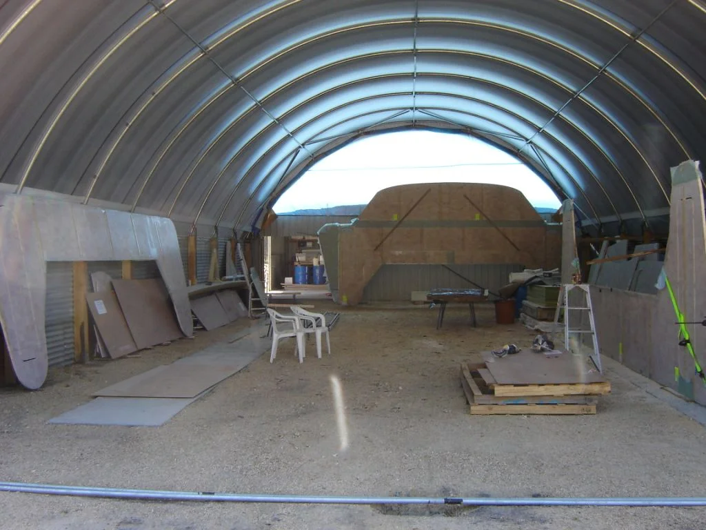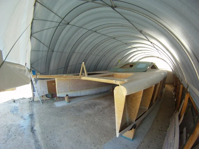 Building the shed. A temporary option was decided to be the best option for us. The lack of a full cement slab didn't cause too much of an issue but did make dust management more of a challenge during fairing and painting of the boat. December 2008.