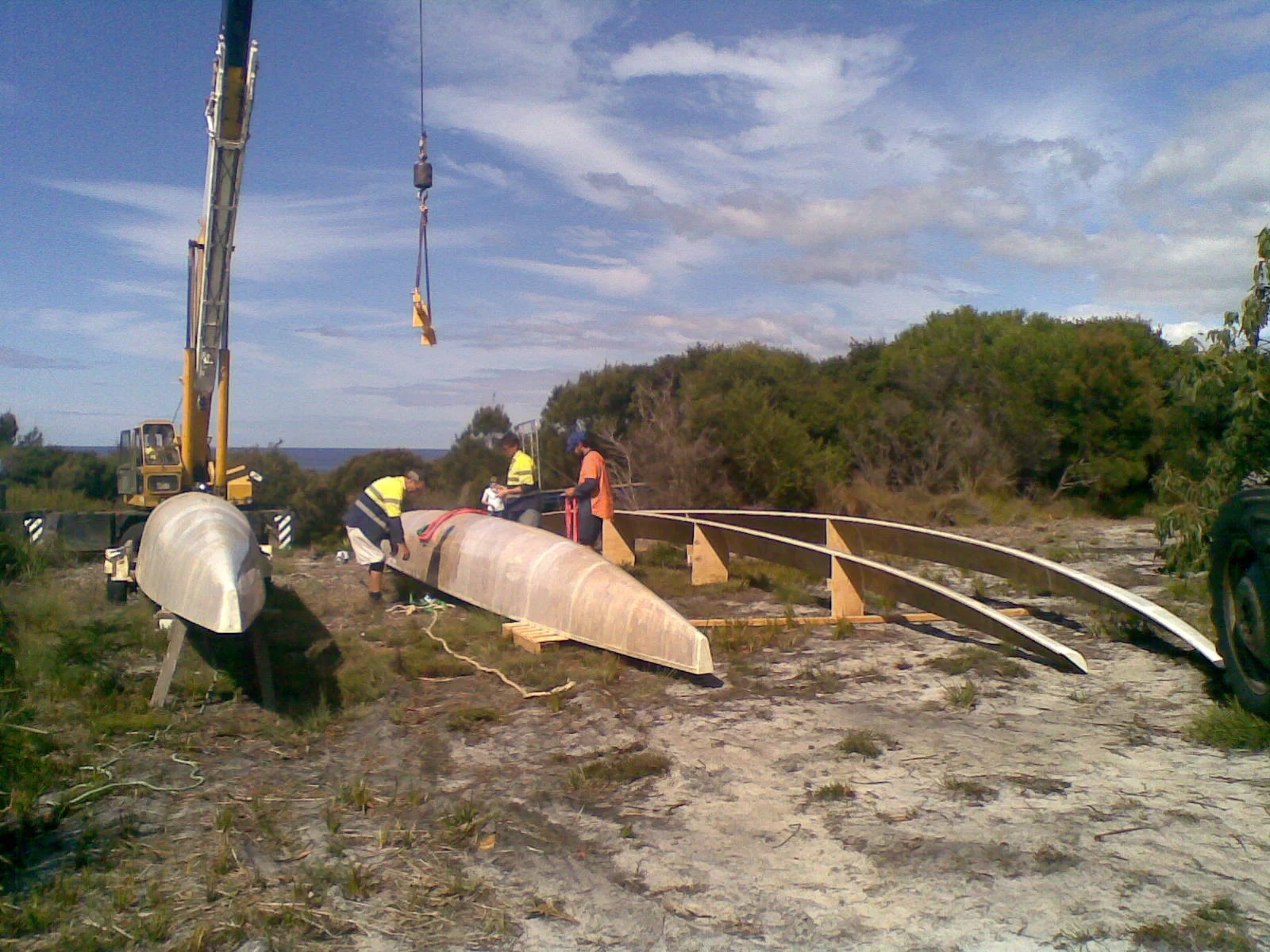 Stage 3 Kit arrives. Moulded Components from Spirited Designs. The resin infused components allow the boat to be assembled on site "right way up" as the hulls were pre fabricated for us at the Spirited Factory in Port Stephens New South Whales by Craig Schionning and road transported to Tasmania. April 2010.