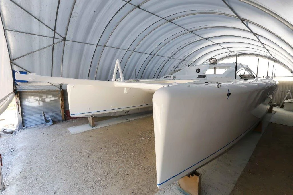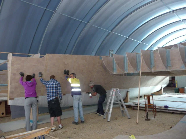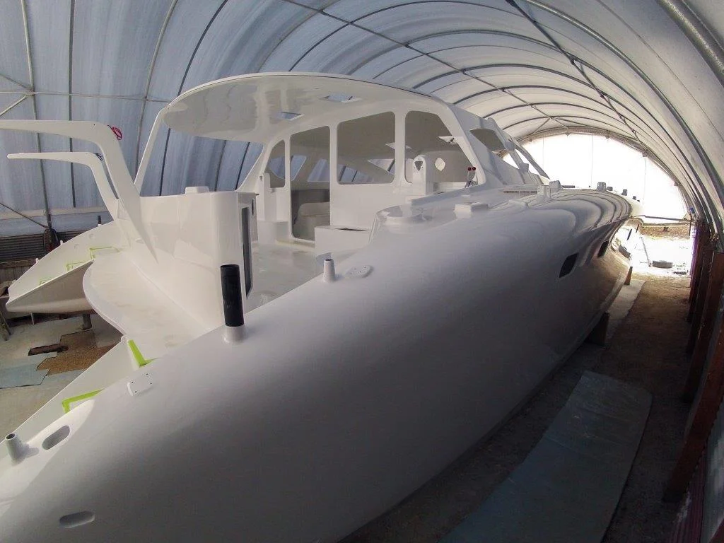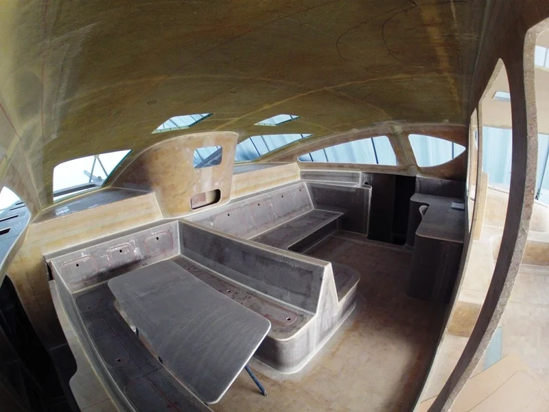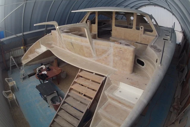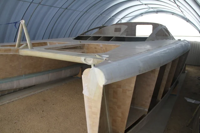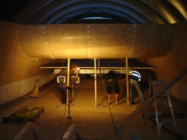 Hull sides on and aft cockpit module off for finishing. June 2012.