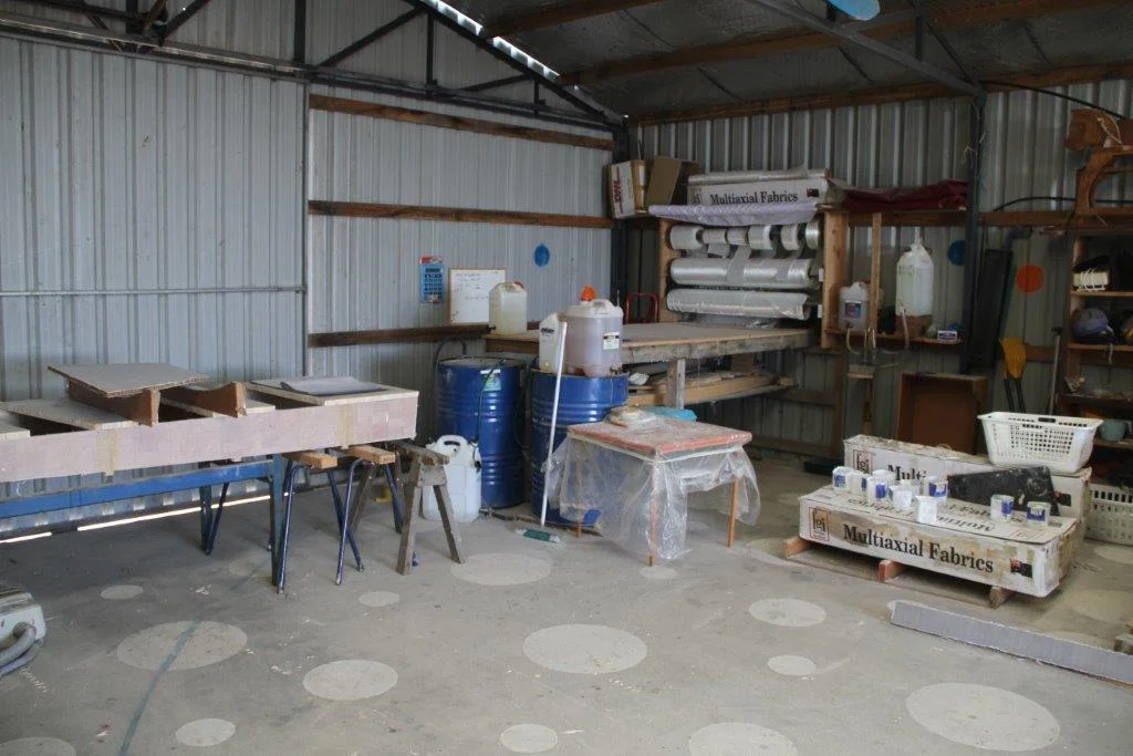 Our fiberglass section of the workshop. This is the 10m x 13m shed of John's that we built the 10m x 18m boat shed immediately adjacent to. Pictured in June 2010.