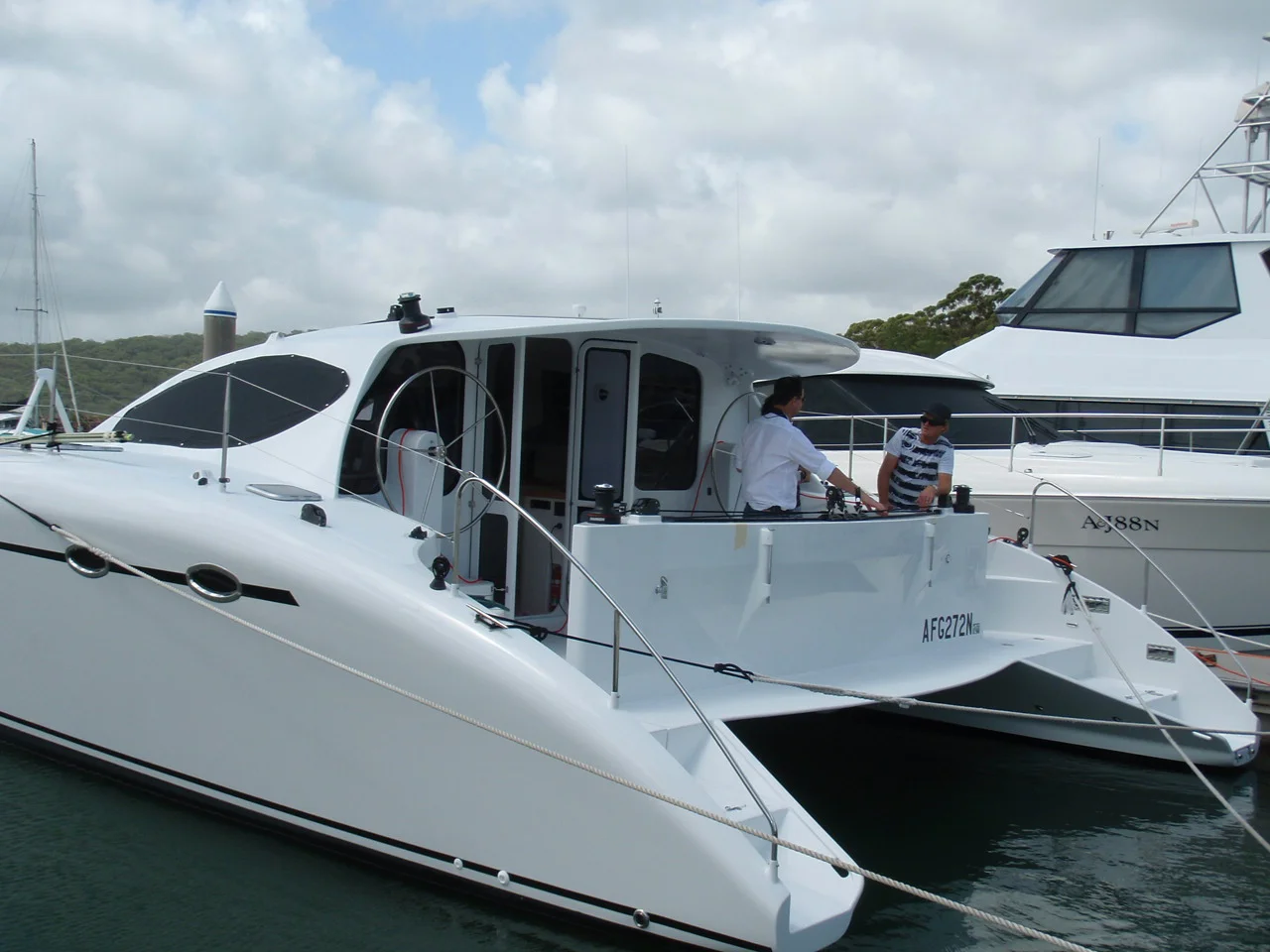 Michael talking boats with Craig and Marina Schionning onboard a newly launched Spirited 380. Port Stephen's NSW. Late 2008.
