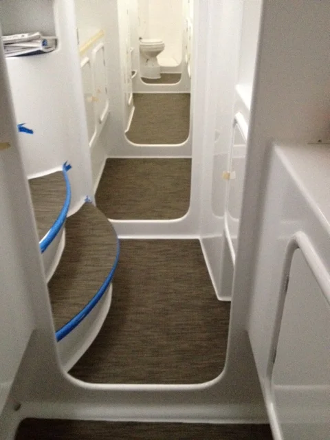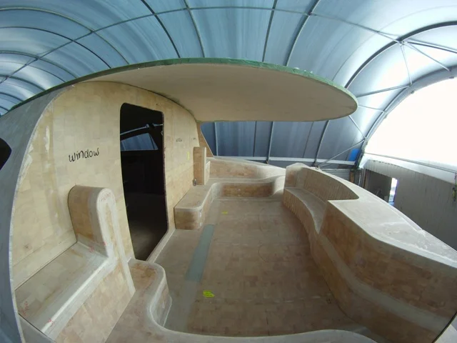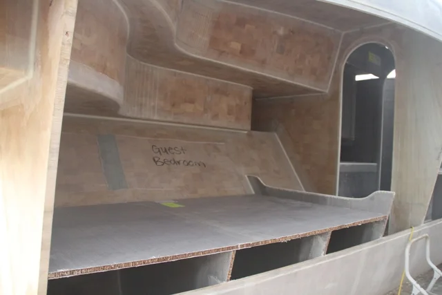 Furniture going in. This is the aft cabin looking from outside the boat before the hull sheer panel was installed. Interior spaces becoming defined allows for you to get a feel of the finished product. April 2011.