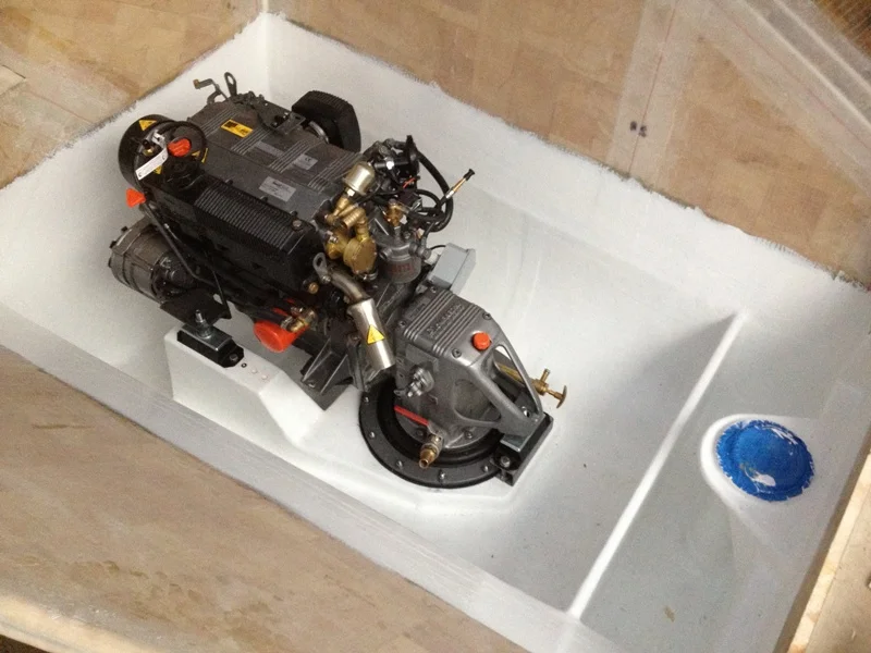 The 40hp Lombardini diesel motors fitted into the boat. Rudder bearings also in. October 2012.