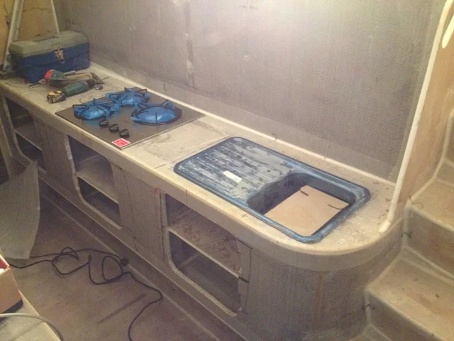 Galley fit out well underway. The choice of galley down was always part of our plan. Galley up for weekending and booze cruising, galley down for live aboard's. March 2013.