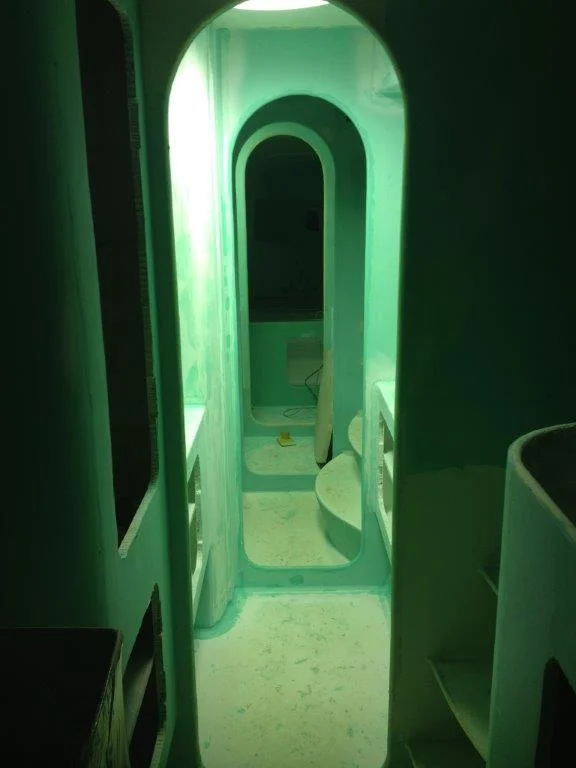 Interior fairing well underway. This is looking aft in the starboard hull. We moved to Jotun products at this stage. The 1:1 pre mixed Jotafair was found to be the most effective in producing a quality finish at a cost effective price however the world of paint systems is a complex one. We found getting consistent advice challenging as everyone has their preferred product and opinion. March 2014.