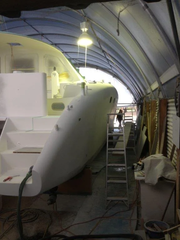 The first "shoot". Russel putting the stbd hull into "sprayable". In 5 weeks Russel and Michael got both hulls sealed, bogged, faired, spray faired and sprayed again with High Build Primer. May 2013.