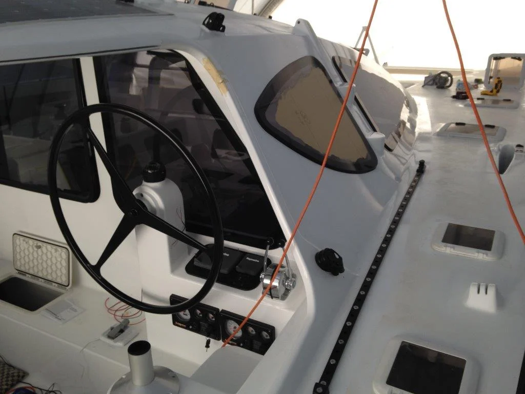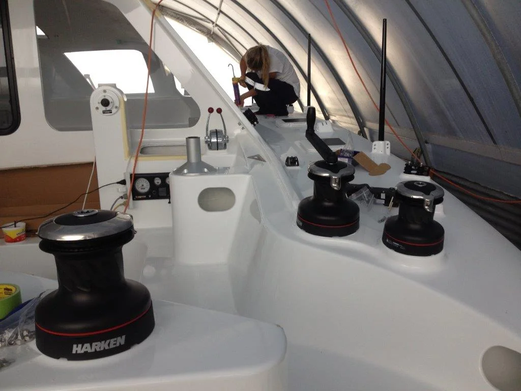 Deck hardware fit out. Roam features primary and secondary winches on the side decks to allow for controlled and safe sail handling. February 2015.