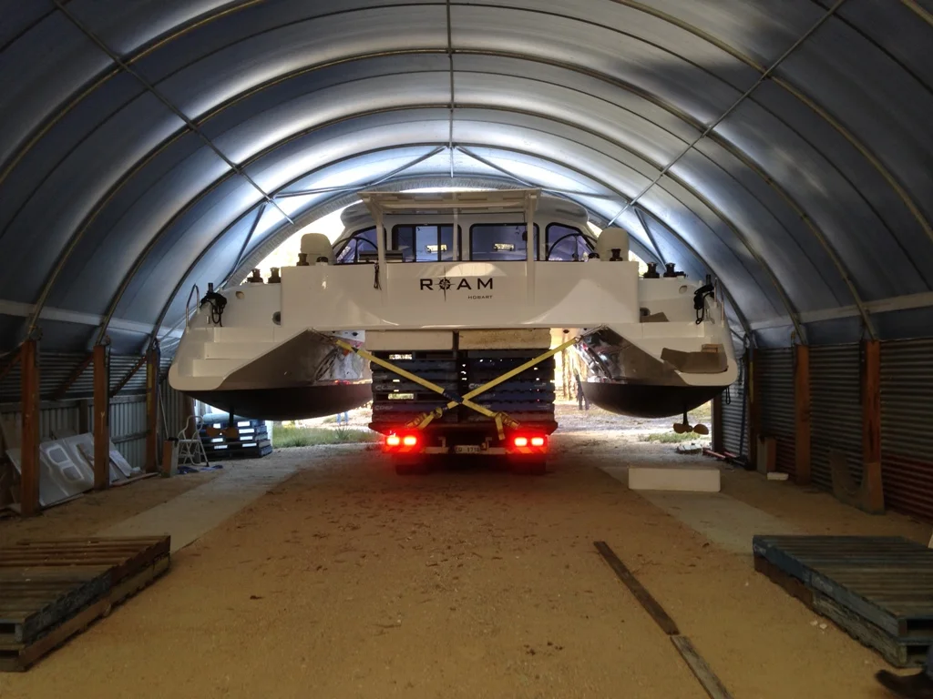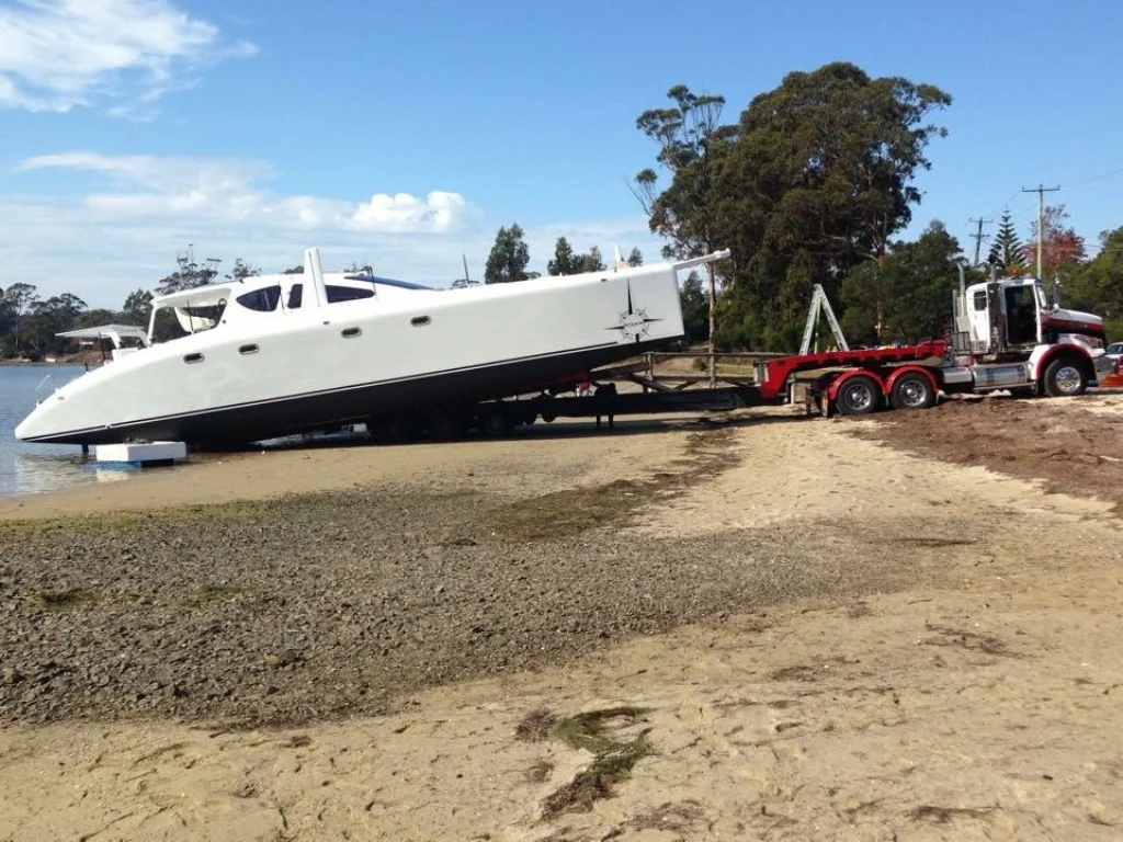 ROAM was launched without crane using Kellara Trasport's "tilt-slide" trailer. The small tides that exist on Tasmania's East Coast meant that the operation had to occur at the peak of the monthly tide cycle. Timing and placement of the boat on the beach was critical. April 2015.